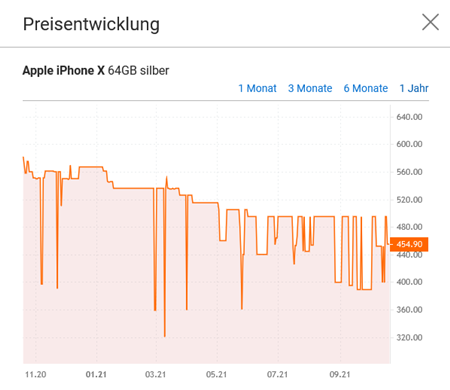 Preisentwicklung iPhone X Die meisten Preisvergleichsseiten bieten auch zeitgleich eine Übersicht der Preisentwicklung eines Artikels an. Dort kannst du genau nachverfolgen, wann dein gewünschter Artikel in der Vergangenheit wie viel gekostet hat. Du kannst somit auch direkt sehen, ob der Preis bereits gefallen ist – oder gerade sogar steigt. Hier als Beispiel anhand eines iPhone X Silber. Ich habe extra ein älteres Modell gewählt, damit einen möglichen Preisverlauf besser einsehen kann. Wie du auf dem Bild erkennen kannst, liegt der Preis bei aktuell 454,90€. Im vorherigen Monat (September) zwischenzeitlich bei 389,00€.