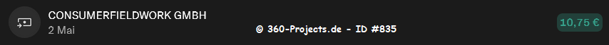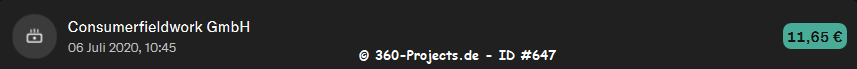 | 1€ / 10 Minuten Umfrage ca. 5-8 Umfragen im Monat 1€ Refprovision Auszahlung ab 30€ in Gutscheine bzw. ab 70€ per Überweisung |