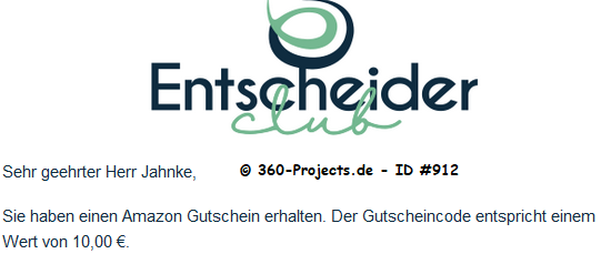Verdienst/Länge: 1€ – 10 Minuten Premium-Umfragen: 3€ – 10 Minuten 2-8 Umfragen pro Woche 1€ für jedes geworbene Mitglied Optional: Entscheiderclub PC-Programm laden – 0.50€ / Monat Optional: Entscheiderclub APP laden – 1.00€ / Monat Optional: Programm & APP laden – 1.50€ / Monat autom. Auszahlung ab 10€ per Bank |