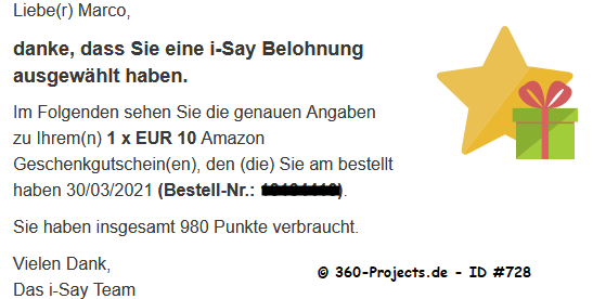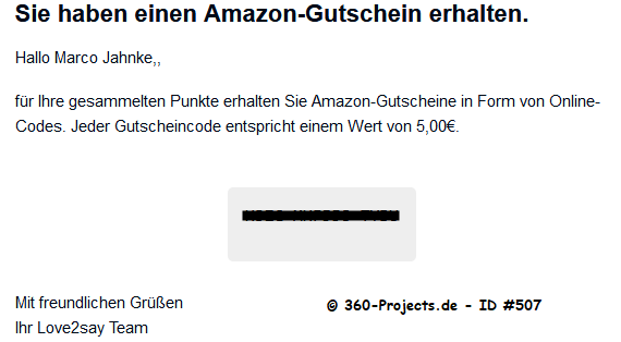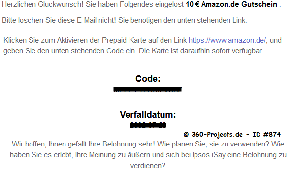 Verdienst/Länge: 1,00 – 10 Minuten 2-3 Umfragen pro Woche bis zu 2,00€ pro geworbenem User Auszahlung ab 5,00€ in Amazon-Gutscheine & ab 10€ per Überweisung |