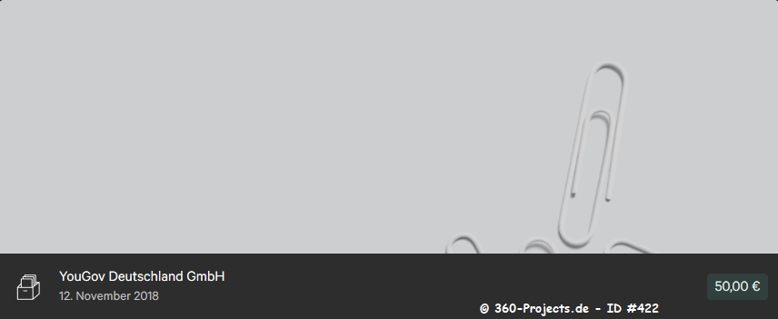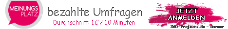 | Verdienst/Länge: 0,70€ – 10 Minuten 1-3 Umfragen pro Woche weitere Umfragen im Loginbereich vorhanden Auszahlung ab 2,00€ per Bank, PayPal und Gutscheine (oder Spende) |