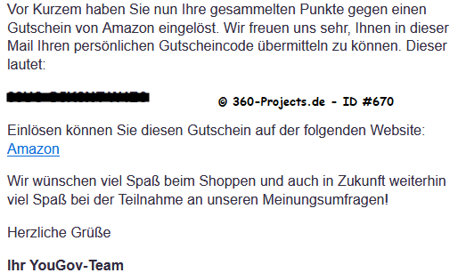 | Verdienst/Länge: 0,80€ – 10 Minuten 2-5 Umfragen pro Woche 0,75€ pro geworbenen User 25.000 Punkte = 50€ Auszahlung ab 50€ per Amazon-Gutschein bzw. ab 2,50€ für einen YouGov-USB-Stick |