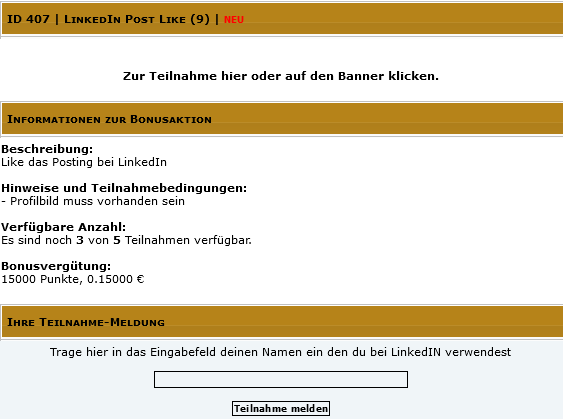 Dort findest du dann Bonusaktionen wie z.B. diese: ID 407 | LinkedIn Post Like (9) | NEU