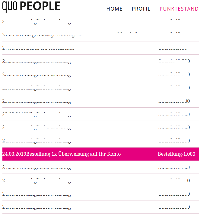 Die zweite Auszahlung hatte einen Wert von 20€ – wie ist das möglich, wenn die Mindestsumme bei Überweisungen 25,00€ beträgt? Genau das ist der Punkt! QuoPeople hat offenbar die Auszahlungsgrenze von 10,00€ auf 25,00€ erhöht und das „mal eben“ ganz heimlich. Auch mein aktuelles Guthaben i.H.v. 1555 Punkten (15,55€) kann ich nicht auszahlen, da ich die Meldung erhalte – dass eine Auszahlung erst ab 25,00€ möglich sei. Zunächst habe ich gar nicht über die 20,00€ Auszahlung nachgedacht und mich eher gewundert – hatte ich da einen anderen Anbieter im Kopf, der bereits ab 10€ auszahlt? Glücklicherweise gibt es einen Kontoauszug, in dem man jede Gutschrift und jeden Abzug (bspw. Auszahlung) einsehen kann und dieser machte mir klar – ich irre mich nicht.